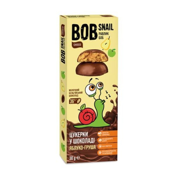 BOB SNAIL ЦУКЕРКИ ЯБЛУЧНО-ГРУШЕВІ В БЕЛЬГ.МОЛ.ШОКОЛАДІ 30ГР
