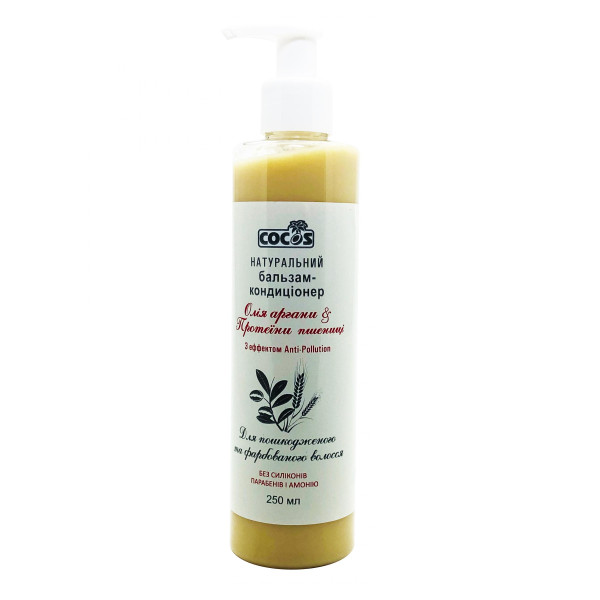 Часте використання фена, плойки та засобів для укладання негативно впливає на стан шевелюри. Не дуже сприятливо діють на локони і сонячні промені, мороз, вітер, фарбування, навіть найщаднішими складами на безаміачній основі. Натуральний бальзам-ополіскувач для пошкодженого волосся з олією Аргани та протеїнами пшениці призначений для ламких і пошкоджених локонів і надає такі впливи: