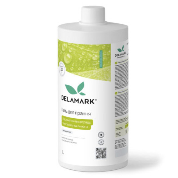Концентрований безфосфатний гель для прання DeLaMark з ароматом винограду, бергамоту та лимона — це універсальний рідкий засіб, що замінює пральний порошок. Призначений для машинного та ручного прання виробів із бавовняних, лляних, синтетичних, штучних тканин, а також тканин зі змішаних волокон. Підходить для всіх типів пральних машин. Ефективно видаляє забруднення різного походження. Підходить для машинного прання на коротких програмах і ручного прання.