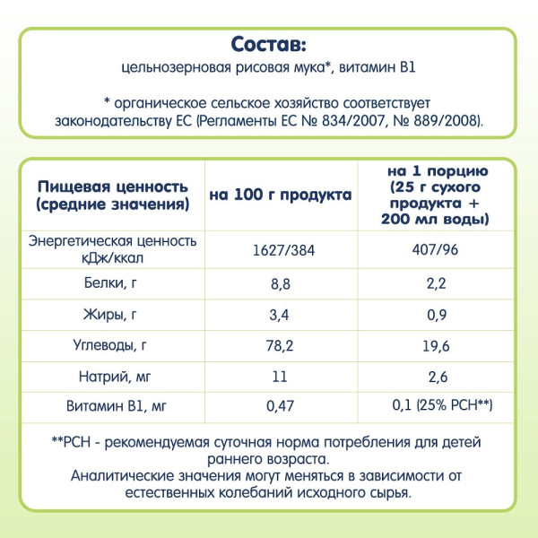 Склад: цілозернове рисове борошно*, вітамін В1