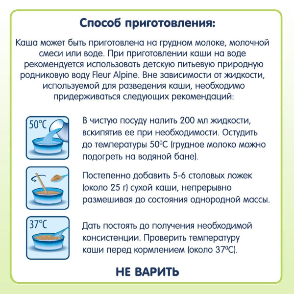 • Дати постояти до отримання необхідної консистенції.Перевірити температуру каші перед годуванням (близько 37 ° С)