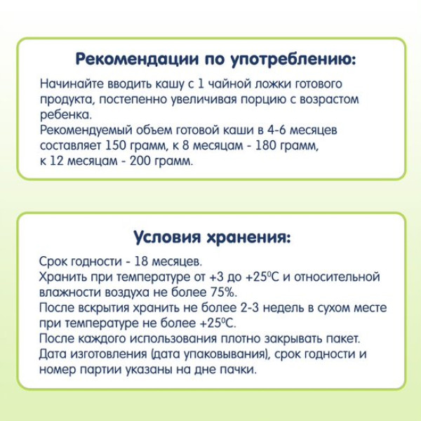 Починайте вводити кашу з 1 чайної ложки готового продукту, поступово збільшуючи порцію з віком дитини. Об'єм готової каші, що рекомендується, в 4-6 місяців становить 150 г, до 8 місяців - 180 г, до 12 місяців - 200 г. Не використовуйте залишки каші для подальшого годування.