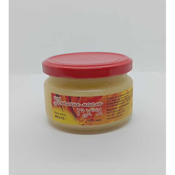 ГХІ - смачний і корисний продукт, виготовлений виключений з натурального домашнього вершкового масла, є ідеальним джерелом поліненасичених жирних кислот з коротким хімічним ланцюгом, що легко засвоюється організмом. Багате вітамінами А, Д, Е, PP, мінералами: калієм, кальцієм, фосфором, натрієм, магнієм, залізом та лінолевою кислотою. Чистий молочний жир є середовищем, у якому уповільнений розвиток мікроорганізмів, і тому така олія є продуктом тривалого зберігання і не вимагає консервації.