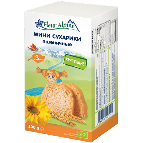 Міні сухарики Fleur Alpine ПШЕНИЧНІ випікаються двічі – ця технологія в Німеччині називається «Zwieback», тобто «подвійна випічка». Завдяки їй сухарики виходять хрусткими, повітряними та смачними.