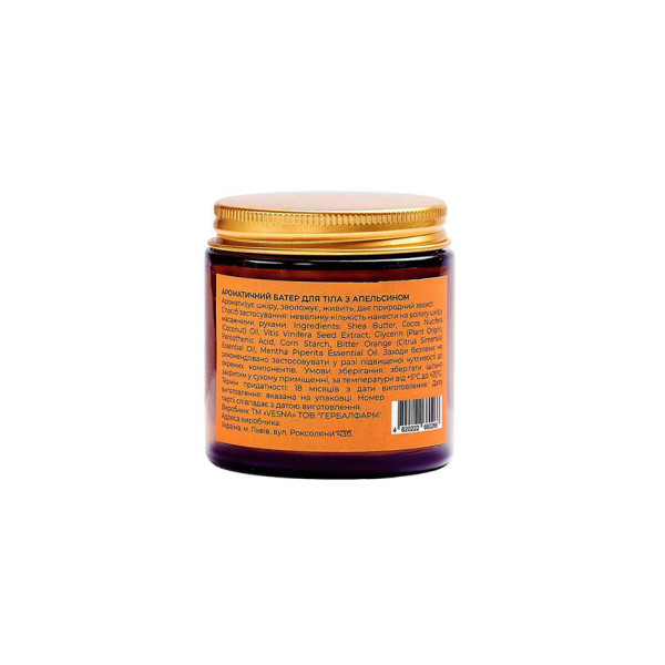 Батер для тіла Апельсин відновлює проблемні ділянки тіла: лікті, стопи, руки. Захищає шкіру від зневоднення та не перешкоджає її диханню. Має щільну текстуру, рекомендуємо використовувати його на вологу шкіру, після душу.